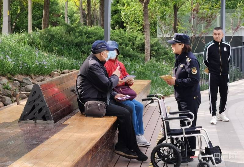 执法人员向游客讲解文明游园法律法规(央广网发 石景山区古城街道供图)