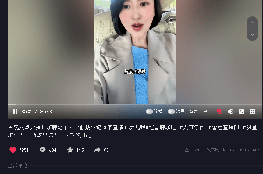 2023年5月2号上午09:33,中央电视台著名综艺节目主持人张蕾在其个人短视频社交平台发文称: