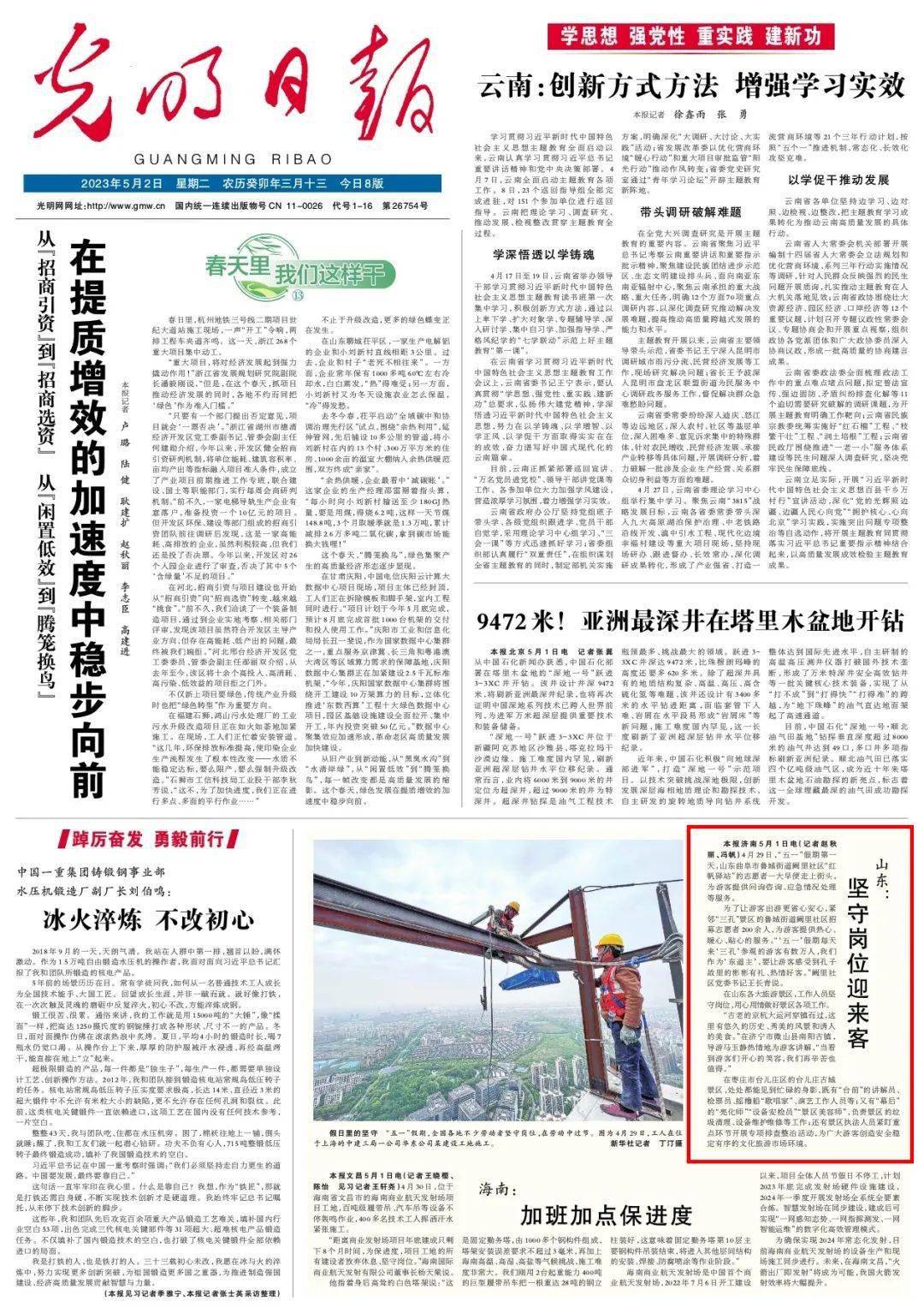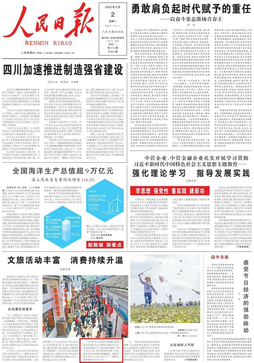 5月2日,《人民日报》头版刊发“五一”重点稿件《文旅活动丰富 消费持续升温》,以山东枣庄薛城区铁道游击队为例,介绍了红色景区旅游热度持续攀升,带动文旅复苏、消费升温。