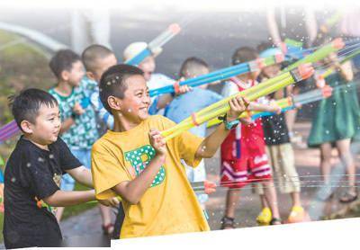 安徽省芜湖市孙村镇一家乡村房车露营地里,小朋友们在开心地打水仗。肖本祥摄(人民视觉)