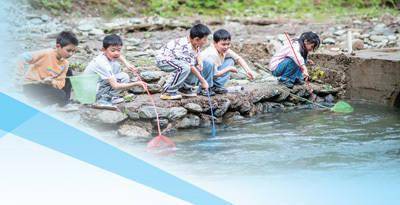 湖南省浏阳市金水河露营基地组织小朋友们打捞河中漂浮物。张淼龙摄(人民视觉)