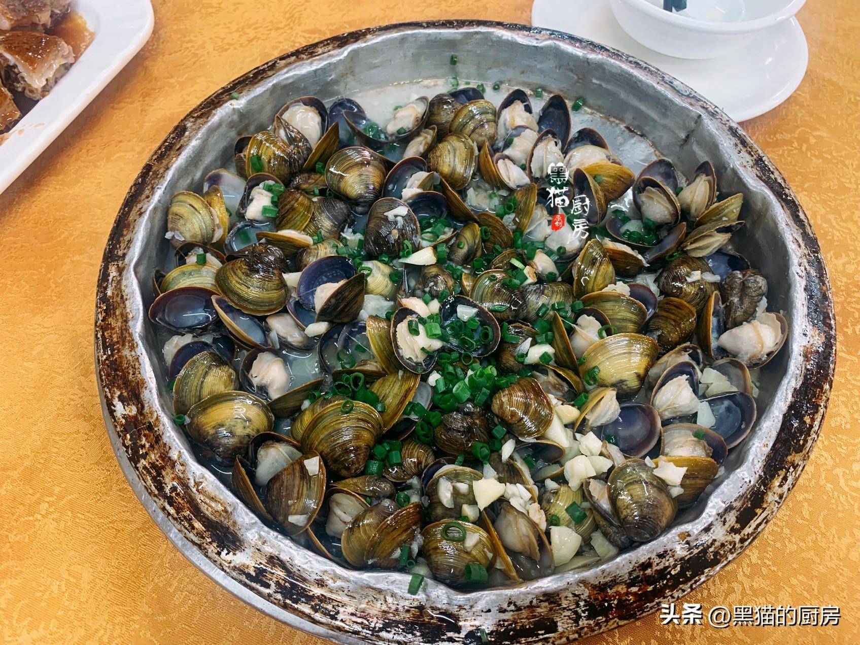 河蚬,吃的就是一个鲜和干净,因为蚬子肉要吐干净,没有细沙,蒸好后撒上炒香的蒜末(蒜末不够细),但是友人们说盘底蒸河蚬的汤非常鲜甜。鲜到好处,蚬肉很饱满肥美(忘记多少钱一盘了)。