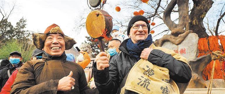 1月25日,第十届北京八大处新春文化庙会上,外国游客装扮成货郎,用中国民俗礼仪拜年送祝福。
