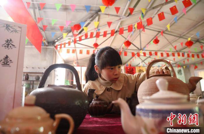 游客在参观不同时期使用的茶壶。 陈家乐 摄