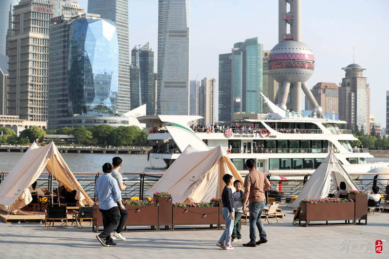 在北外滩滨江露营,看景同时自己也成为一道风景。