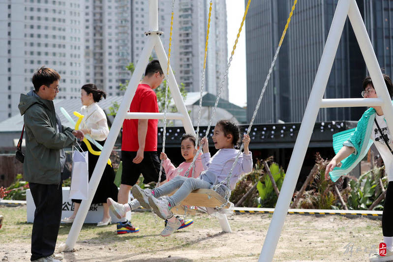 孩子们在楼顶口袋公园荡秋千。