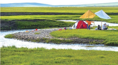 内蒙古自治区锡林郭勒盟西乌珠穆沁旗绿草如茵,游客在河畔露营。新华社记者 彭 源摄