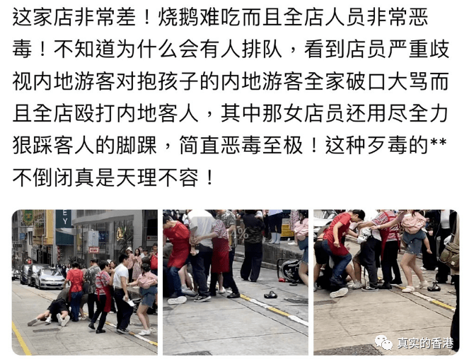 很快地,在这家店的点评上,就出现了内地游客的发帖:这家店的烧鹅难吃,而且全店人员非常恶毒,店员严重歧视内地游客,对抱孩子的内地游客全家破口大骂,而且全店殴打内地客人,其中那女店员还用尽全力狠踩客人的脚踝,简直恶毒至极!
