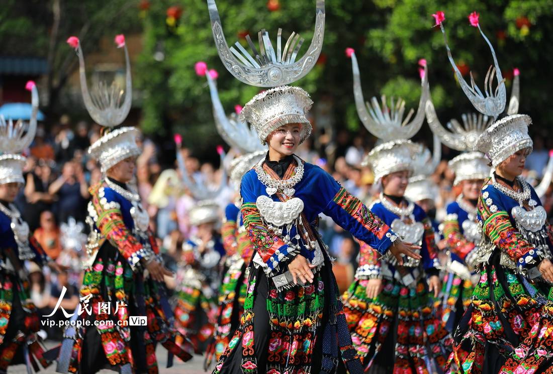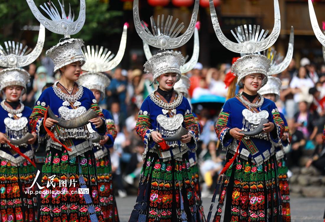 2023年5月1日,在贵州省黔东南苗族侗族自治州雷山县西江千户苗寨,村民在表演民族歌舞。