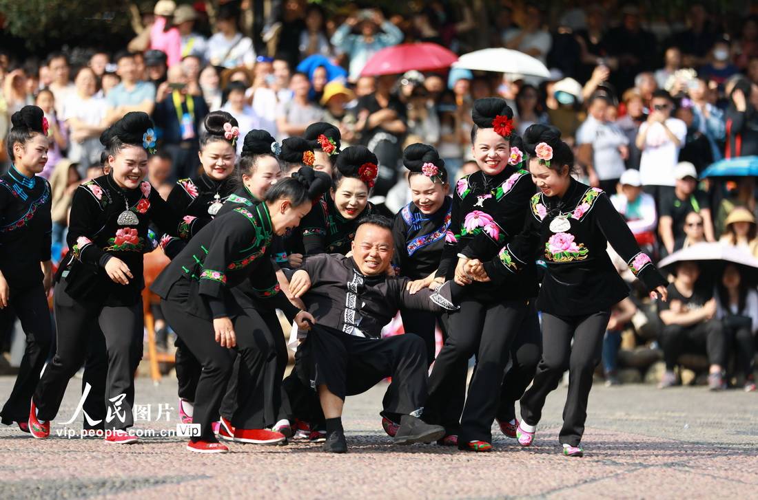 2023年5月1日,在贵州省黔东南苗族侗族自治州雷山县西江千户苗寨,游客和村民一起跳板凳舞。