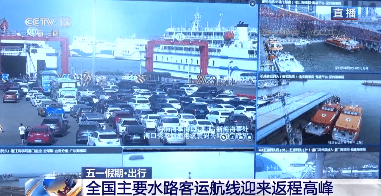 总台央视记者 陈晰:今天是五一假期最后一天。全国主要水路客运航线迎来返程高峰。琼州海峡今天预计有约20万人次过海,海口秀英港将开行客滚船约232班次,湛江海安新港将开行客滚船约280班次。假期5天,琼州海峡预计共运送旅客约90万人次,比去年同期增长1倍以上。在粤港澳大湾区,深圳蛇口邮轮母港和宝安机场码头,今天也迎来大客流。这两个码头今天将开行高速客船约155班次,约20万人次进出港。