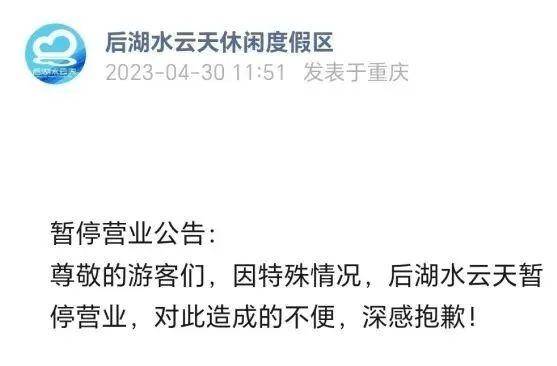 2023年4月30日,该公众号发布公告:因特殊情况,后湖水云天暂停营业。