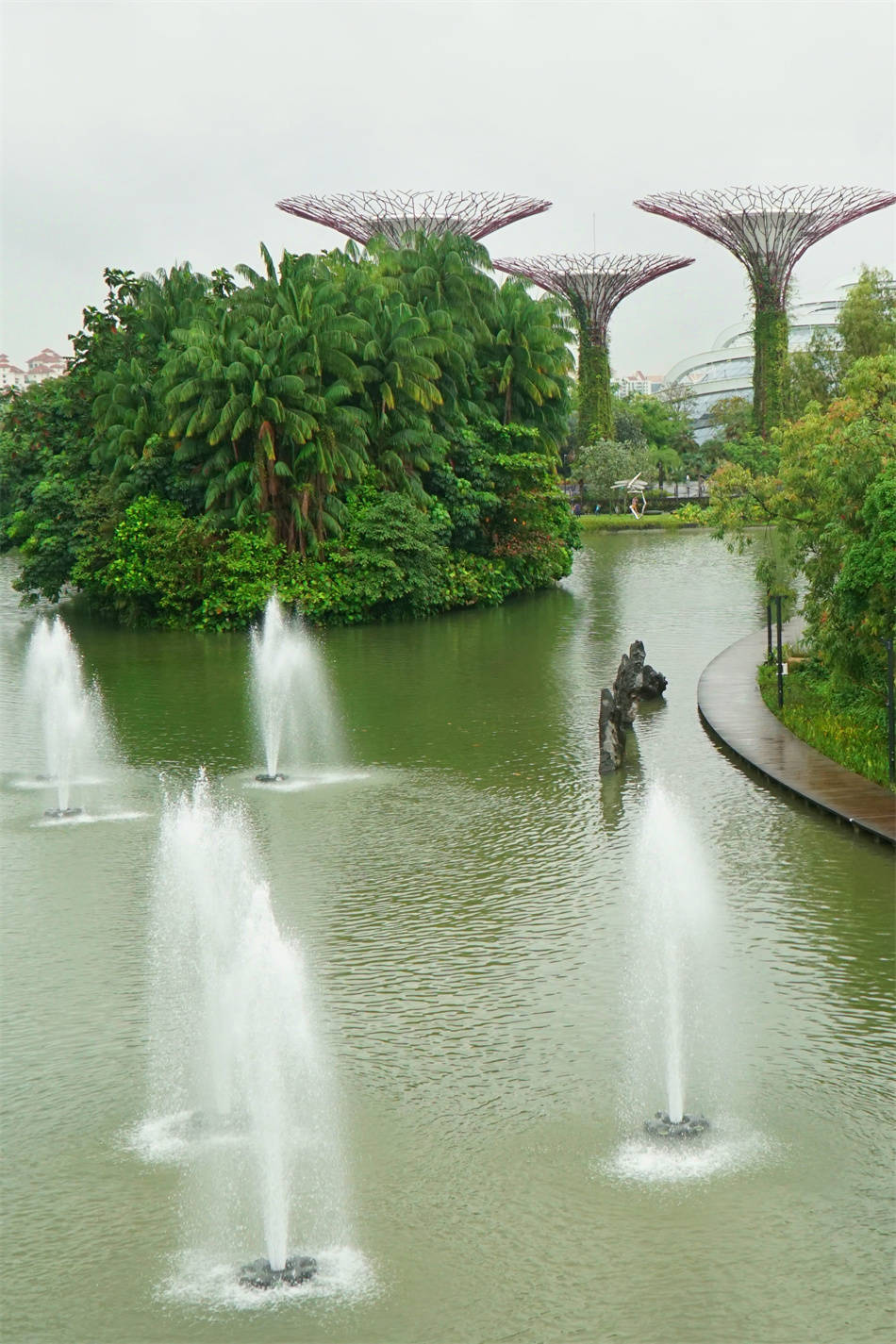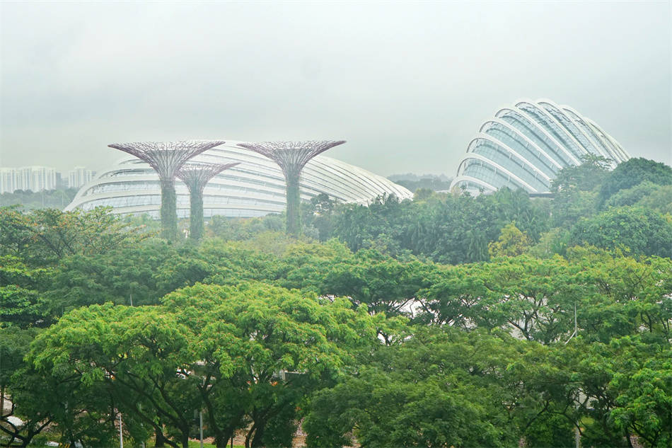 滨海湾花园占地一千五百多亩,这是填海获取的土地,新加坡政府全部用于建造花园。登高远望,这个花园几乎望不到边,苍郁迷茫,犹如热带丛林。