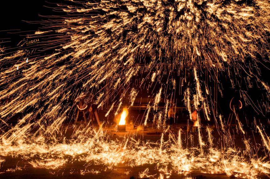 据介绍,此次举行的“打铁花”是一种民俗文化表演技巧,至今有千余年历史,属非物质文化遗产。在表演中,师傅用高温将铁融化为铁汁,表演者轮番将铁汁击打到棚上,形成十几米高的铁花,场面颇为壮观,吸引了众多游客观看。