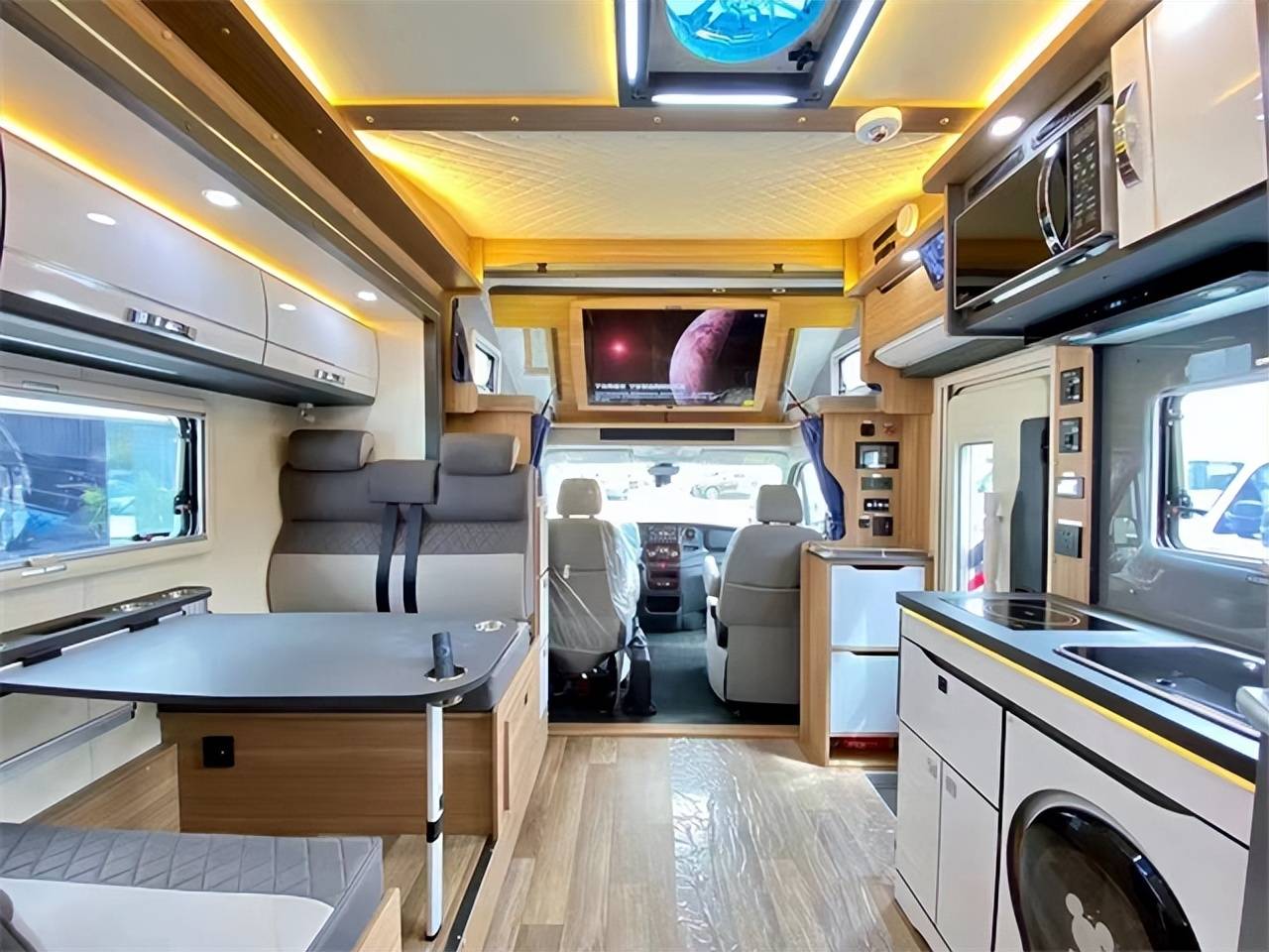 进入到室内,整体内饰风格是实用化的家具温馨风,深灰色沙发包覆和深灰色家具饰板搭配白色光源,大部分家具饰面以原木风格为主色调,整体看起来十分温馨。驻车后打开拓展机构,内部空间十分大。布局方面,由前置额头床、会客区、厨房区、卫浴间、尾部睡卧区组成,布局清晰,各区域功能齐全,只为带给乘客高品质的旅居生活。