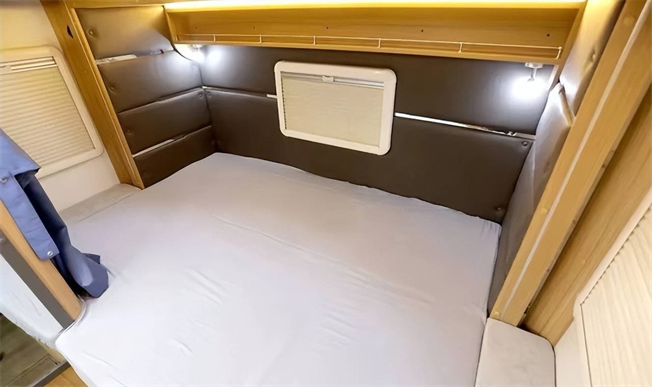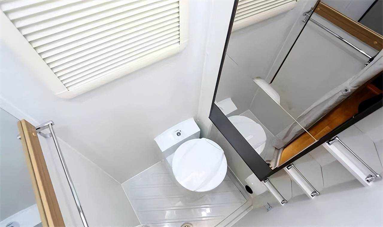 干湿一体式卫浴区配备了折叠面盆、抽拉水龙头、化妆镜、储物柜、多美达马桶、外推窗等设施,解决户外旅行卫浴、洗漱问题;顶部还配备顶置双向换气扇,加快内部空间空气循环。尾部睡卧区是一张横置床设计,拓展机构打开后,可睡上两个成年人。