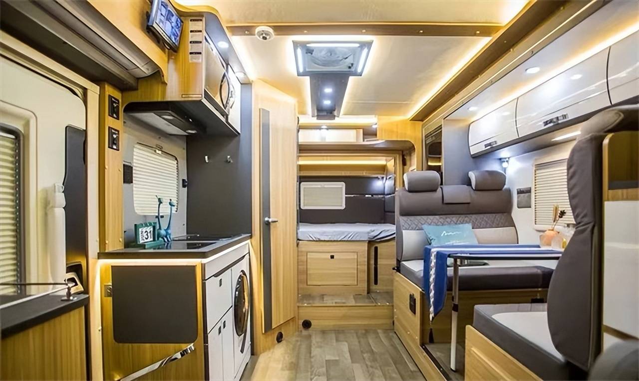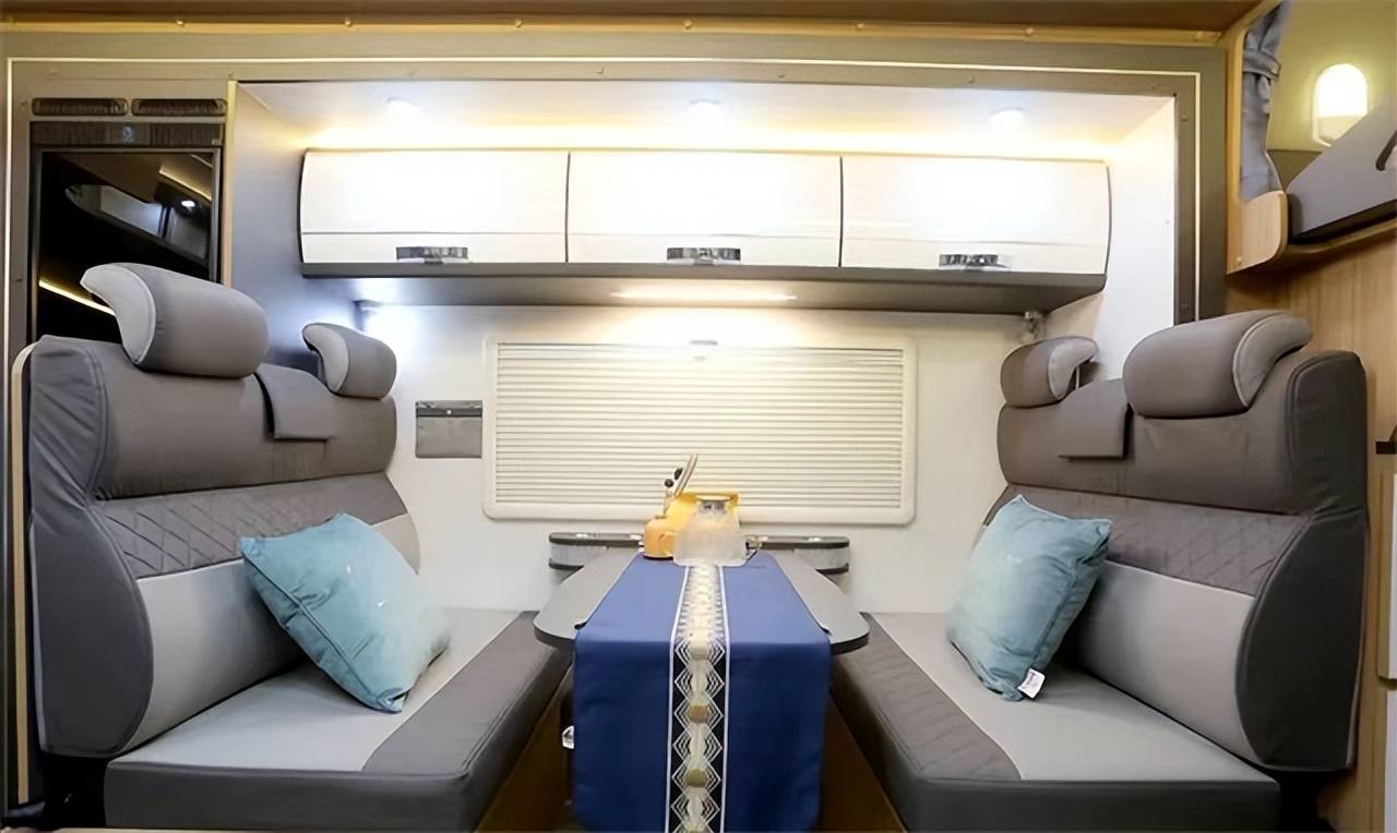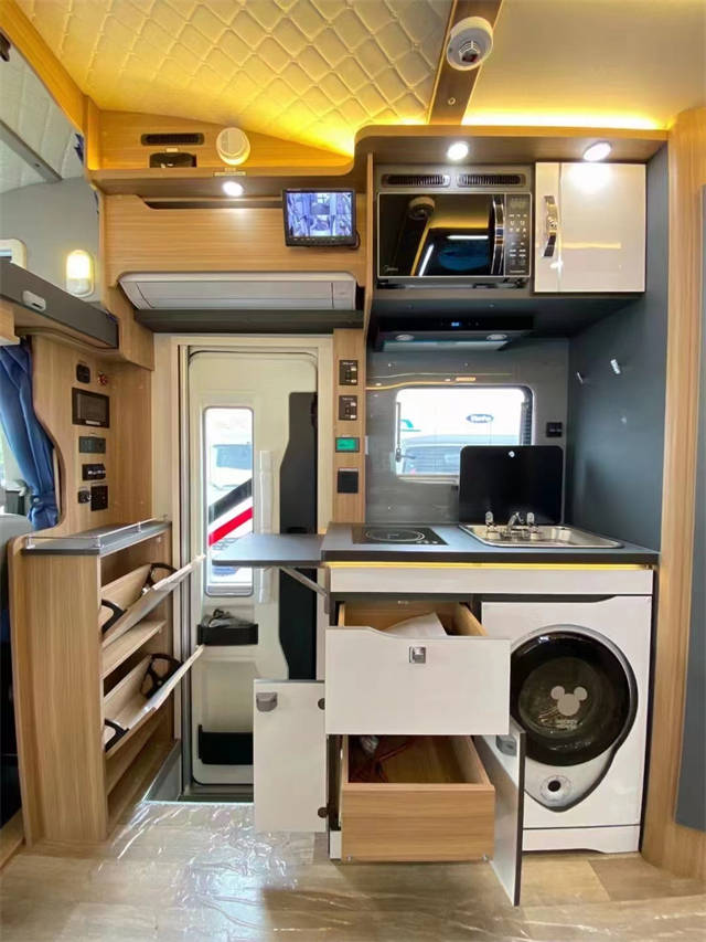 会客区为传统的对向四人位卡座设计,桌板上和靠近墙面的位置有杯架,顶部为三个储物吊柜。厨房位置拥有折叠桌板,桌面上为电磁炉和带盖板的洗菜池,顶部为多功能微波炉。下方则是橱柜和洗衣机。旅途中基本的做饭和洗衣需求可以得到保证。