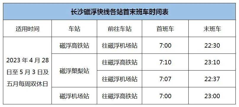 2、磁浮快线:5月3日及五月每周双休日(即5月7日、13日、14日、20日、21日、27日、28日),长沙磁浮快线运营服务时间将延长至23:00(即磁浮高铁站运营时间为7:00-22:30,磁浮机场站运营时间为7:00-23:00)。