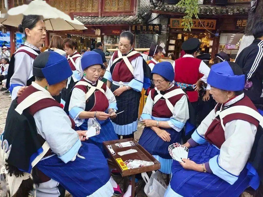 勤劳的纳西妇女早早地起来挑水、洗菜,有的上街摆摊、做买卖;纳西男子悠闲地出门遛鸟,围在四方街花台旁聊天;赶集的母女在卖纳西服饰的小摊前停下,试穿传统的围腰和羊皮披肩;云锣声中笛声悠扬,小花台前聚集的人们唱起纳西古乐;纳西阿妈自在地聚在大树底下打着桥牌;年轻人三五成群嬉闹着逛街……