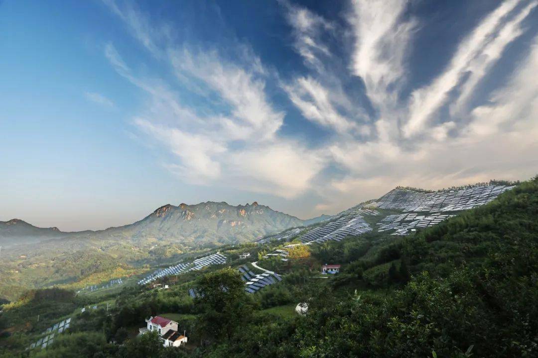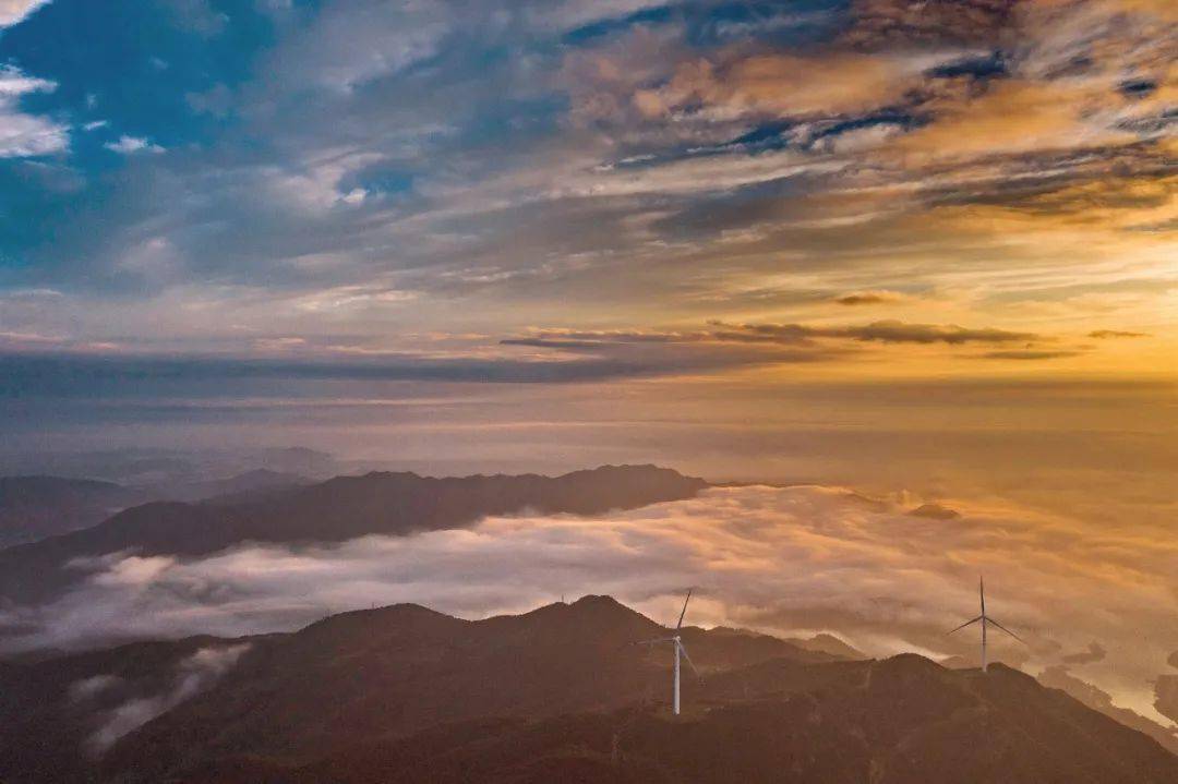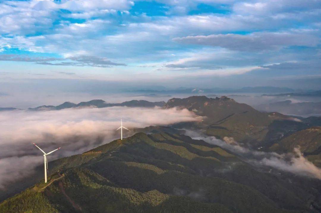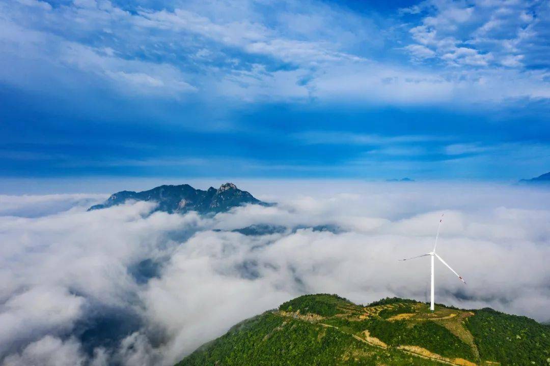 站在山顶看远处,群山环绕、天山相连,还能看见史河水域露出的一角,还有白色的电力风车分布于山头之间,更是增添了别样的美。