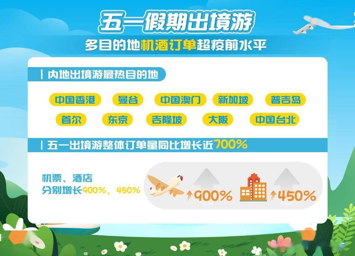 随着今年以来入出境政策陆续放宽,五一假期成为近三年来出境游规模最盛的小长假。从整体订单量来看,五一内地出境游整体订单量较去年同期增长近700%,出境机票、酒店订单量分别较2022年同期增长近900%、近450%。