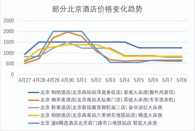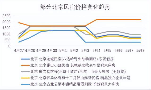 从北京部分民宿与酒店的价格趋势来看,节假日期间的确都存在不同的涨价行为,但整体来看除个别酒店外涨幅均控制在200%-300%之间,甚至有个别民宿在五一期间逆势降价。