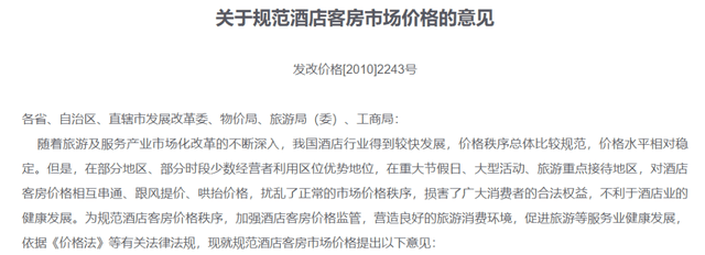 2010年,国家发改委等三部门联合发布的《关于规范酒店客房市场价格的意见》提出,旅游热点区域和大型活动场所周边地区可根据价格法的规定,对酒店客房价格实施最高限价等临时价格干预措施,保证酒店客房价格的基本稳定。对于具体限价标准,国家并没有统一的区间,由各地自行把握。