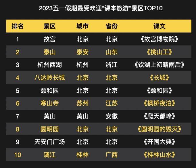值得关注的是,今年五一假期,“跟着书本去旅行”成为亲子游新风潮。曾出现在中小学课本上的,既能放松身心、又能寓教于乐的景点受到年轻父母的偏爱。故宫、泰山、西湖、八达岭长城、颐和园、寒山寺、黄山、圆明园、天安门广场、漓江位列热门“课本旅游”景区前十。
