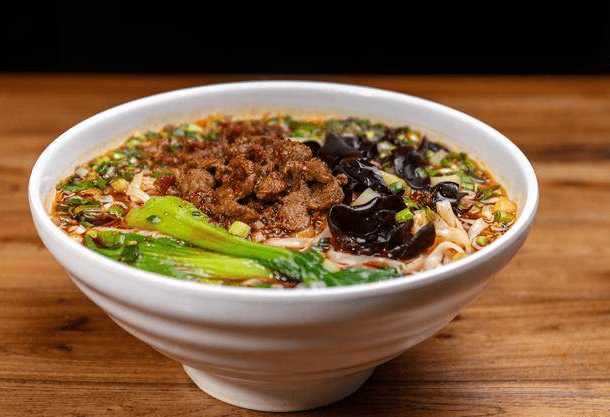油泼面是起源于明代,集酸辣、香辣、鲜香味道于一体的陕西传统特色面食之一,中国最出名的十大面条之一,正宗的面食通常是将手工制成的面条在煮熟过凉后捞入碗中,放入花椒粉、辣椒粉、盐等配料,再浇上一勺滚烫的采菜油,最后调入适量的酱油和香醋,即可食用。