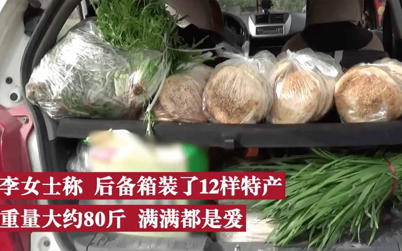 在父母眼中,你的车门一关,再回来又不知道是什么时候,只能是期盼着,在车的后备箱当中,这些都是父母无言的爱,蔬菜、家禽、鸡蛋可以说是应有尽有。