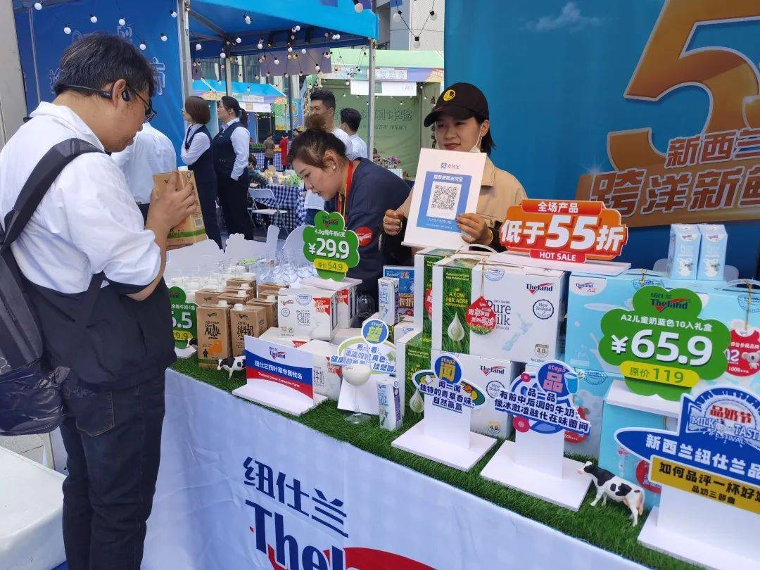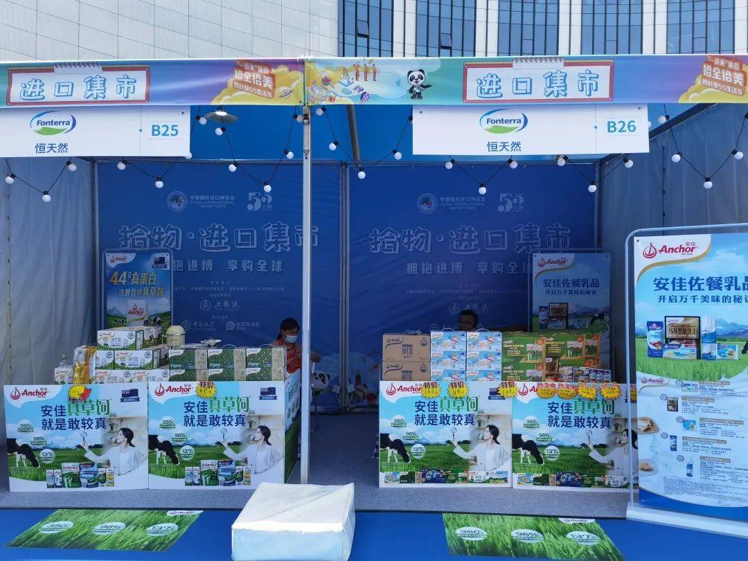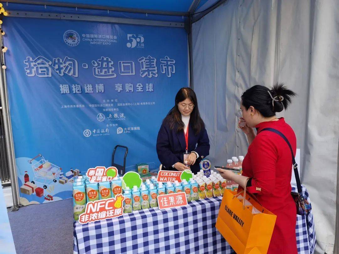 在进口市集各摊位前,恒天然、纽仕兰、佳农、正大集团等进博会参展商都带来了自己的明星产品,供现场市民试吃或者购买。此次进口市集严选消费品、食品、保健品等优质进口商品,共有18家世界五百强和行业龙头企业带来牛奶、水果、零食等各类商品。