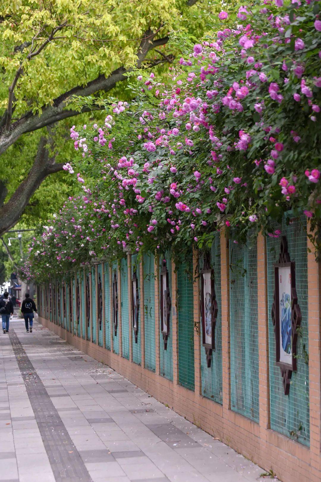 古华路古华中学围墙上的月季盛开得非常惊艳,满满的月季花盛开墙顶。
