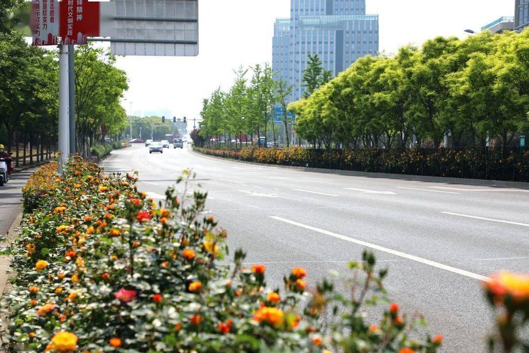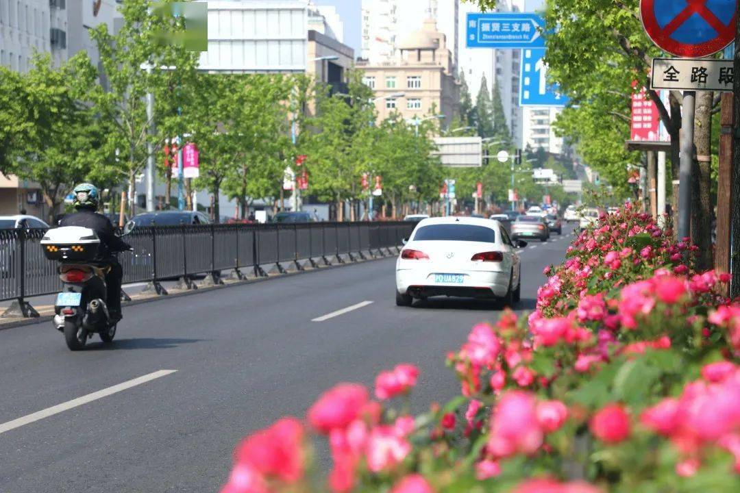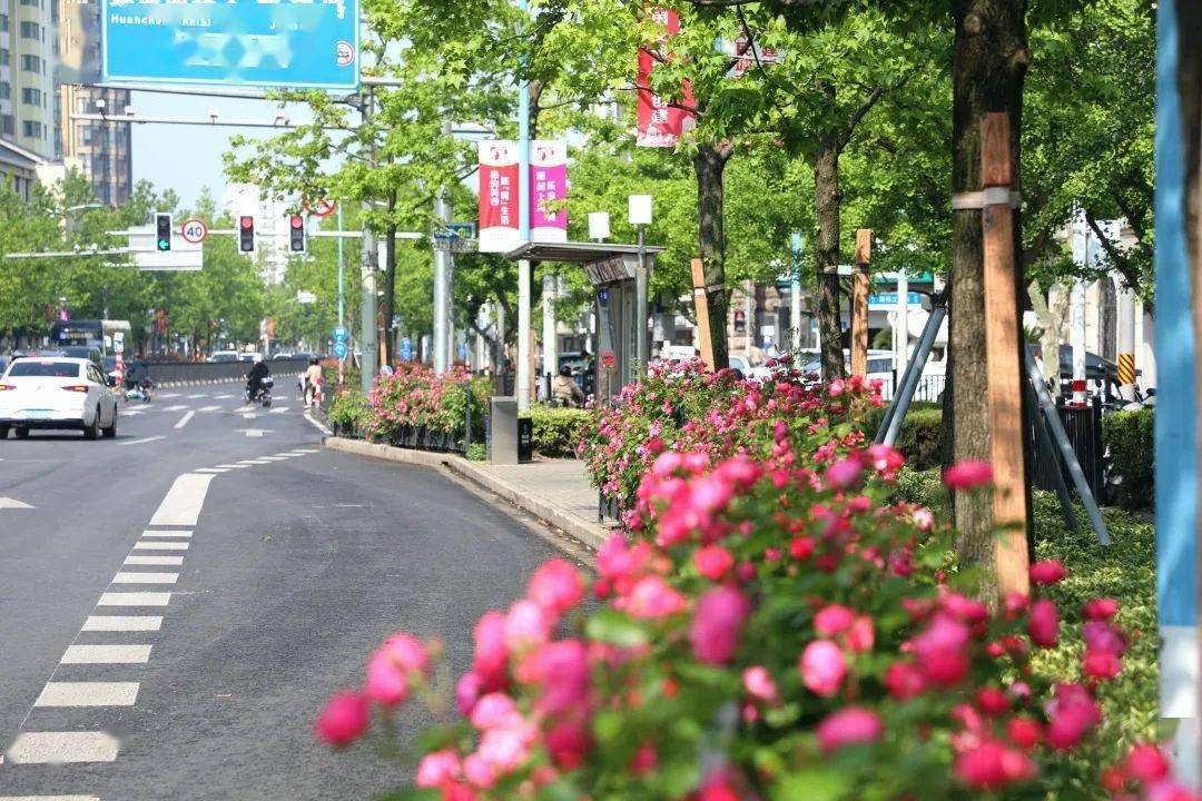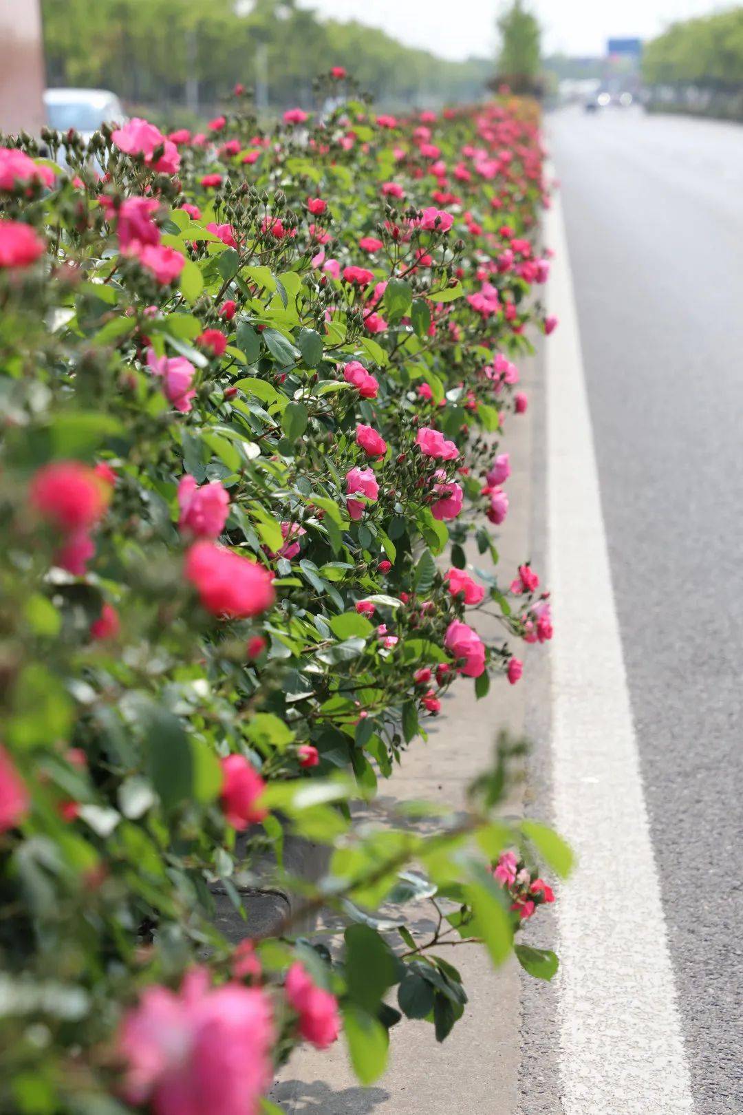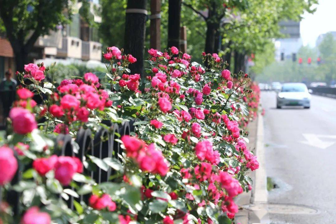 南亭、南奉公路(沪杭公路—环城东路)两侧的隔离护栏上, 4公里长的安吉拉月季微笑向阳、纷纷绽放。