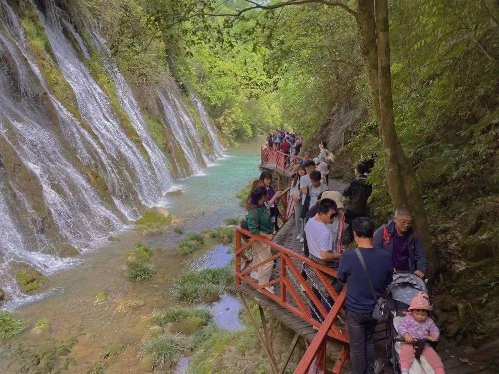 在中坝大峡谷,迎宾瀑的走廊上人头攒动,欢声笑语不断。游人们三五成群,漫步山中,绚丽多姿的风景引得不少游人驻足欣赏,拍照留念。