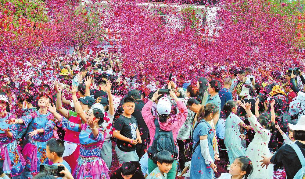 游客参与昆明晋宁区昆阳街道下方古城村“三月十三”民间民俗米线节的“仙女散花”活动。记者 杨峥 通讯员 杨崇云 摄