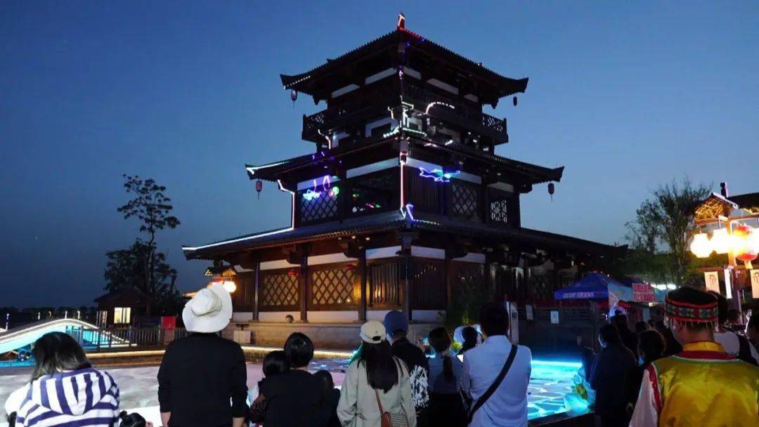 夜幕降临,景区灯火辉煌,绚丽的灯光在夜幕中流光溢彩,点亮了夜色。