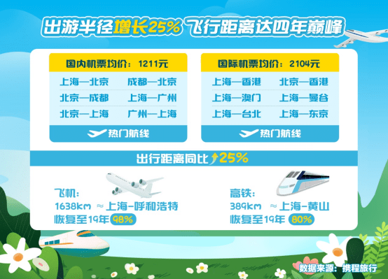 疫情后的首个小长假,国内游客旅行热情高涨。报告显示,“五一”期间用户平均出游半径较去年同期增长25%,其中飞 机出行平均距离为1638km,约等于上海飞往呼和浩特的距离,达到4年来巅峰,基本恢复至2019年同期水平。“高铁游”出行距离同样大幅提升, 用户单程平均出行389km,恢复至2019年八成水平,约等于上海至黄山的单程距离。