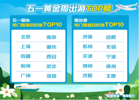 旅游目的地方面,根据目的地旅游整体订单量,报告发布了五一 “热门旅游目的地TOP10”,分别是: 北京、上海、成都、杭州、广州、南京、重庆、西安、武汉和深圳。