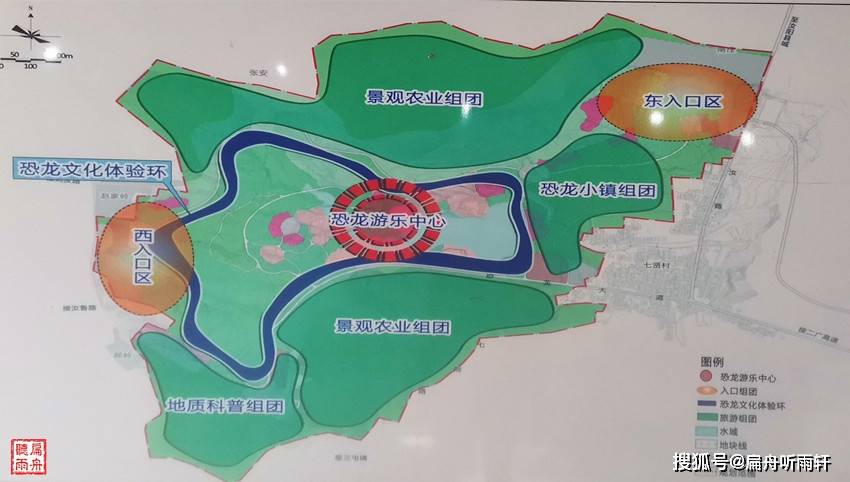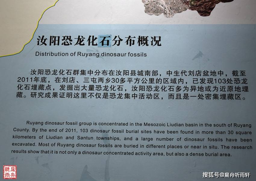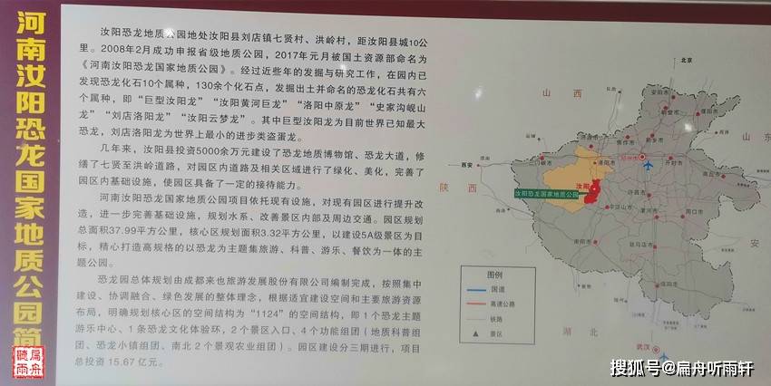 地址公园坐落于南距汝阳县城十公里的七贤村和洪岭村。经过多年的发掘和研究,园区已发现恐龙属种10大类、化石点130多个,命名了6种恐龙:即“汝阳黄河巨龙”“洛阳中原龙”“巨型汝阳龙”“史家沟岘山龙”“刘店洛阳龙”及“汝阳云梦龙”。其中,巨型汝阳龙超越阿根廷龙成为世界最大的恐龙,汝阳黄河巨龙为亚洲体腔最大的恐龙,刘店洛阳龙为世界上最小的进步类盗蛋龙,洛阳中原龙填补了中国无结节龙类甲龙的空白。