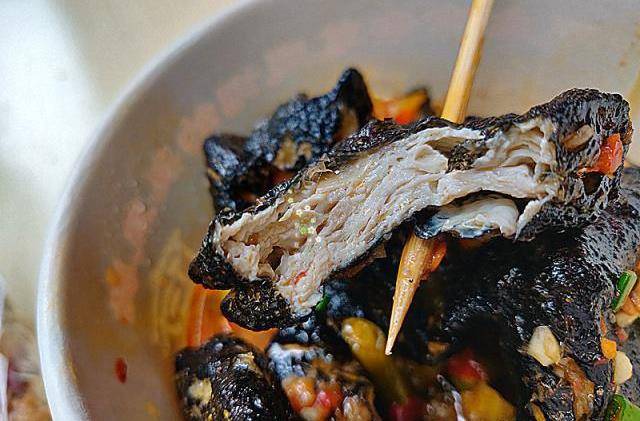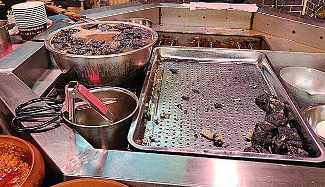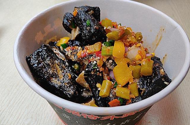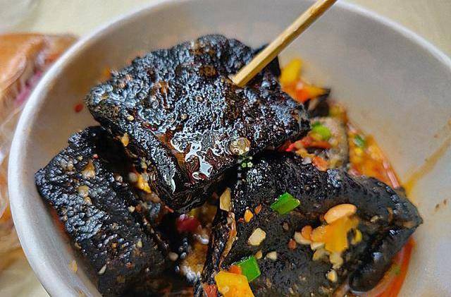 旁边是油炸的黑色臭豆腐,前面这个大盘子用来滤油的,这样臭豆腐不会太油腻。