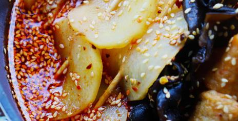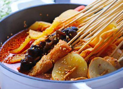 第五步:我们炒出红油后倒入半锅鸡汤,加入适量的鸡精时盐还有白砂糖,五香粉,酱油,蚝油,辣椒油进行调味,煮三分钟之后将香料捞出,这个时候汤料就做好了,我们再撒上一些白芝麻就可以了。我们将已经用竹签穿好的食材浸泡在红油中翻滚几圈,让它沾取红油,就可以食用啦!