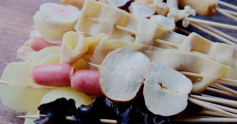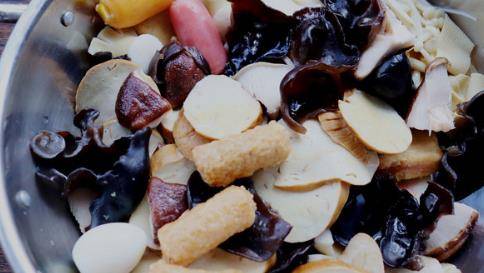 第三步:我们将所有的食材煮熟后捞出备用,我们将它用备好的竹签都穿起来就可以了。