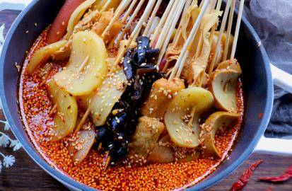 吃鸡不见鸡,这种竹签上的经典美食,既不是麻辣烫,也不是串串香,它有一个非常特别的名字:钵钵鸡。钵钵鸡的食材,无论荤素,基本上以口感带脆的为主,荤素分开煮熟,一般的钵钵鸡能用到鸡的部分主要是鸡皮,郡肝,鸡心等,鸭肠和花肠等味道较重,一般大家都会用小苏打抓取均匀腌制后再煮,还有将鸡熬煮鸡汤,等到所有食材准备好后用竹签串起来。钵钵鸡它源于四川乐山,有着上百年的历史,它的钵钵是只瓦罐,我们在钵内倒满红油汤汁,再把各种食材煮熟后穿成串浸泡于钵中,吃起来还方便又脆爽,别有一番滋味在心头。