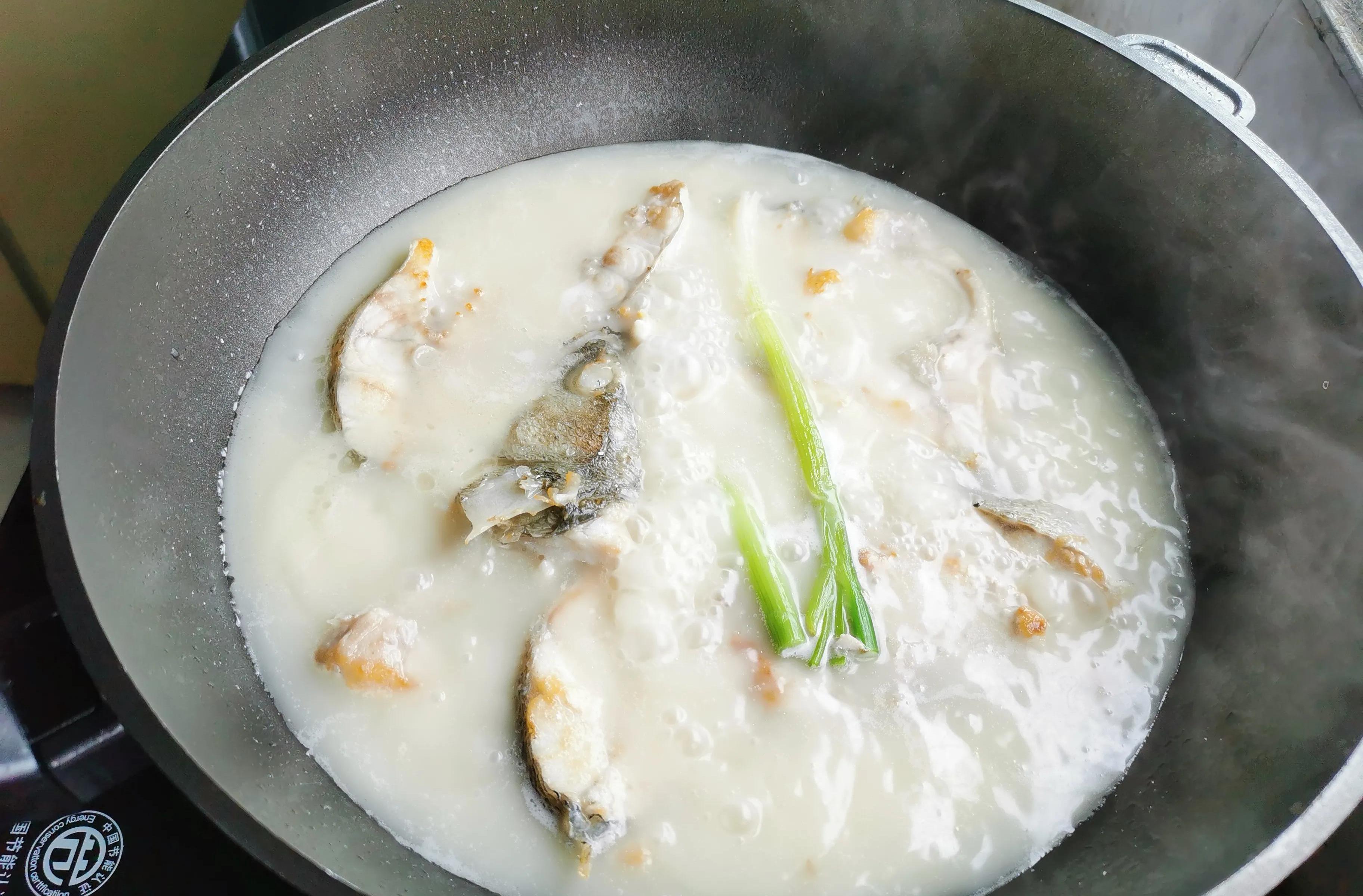2.再倒入烧开的开水,一定要用烧开的开水,这样煮出来的鱼汤才会又浓又白,再放入一根葱头,焖5分钟左右。