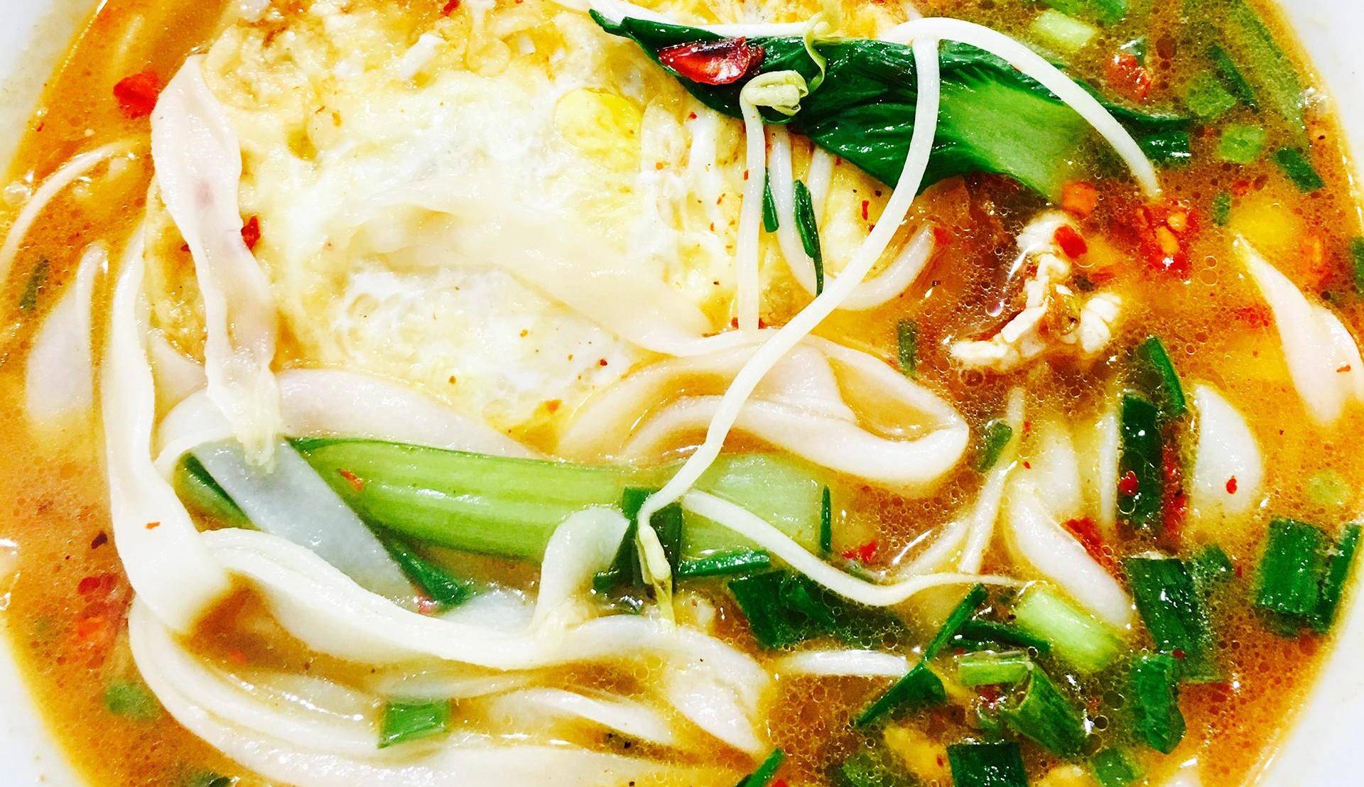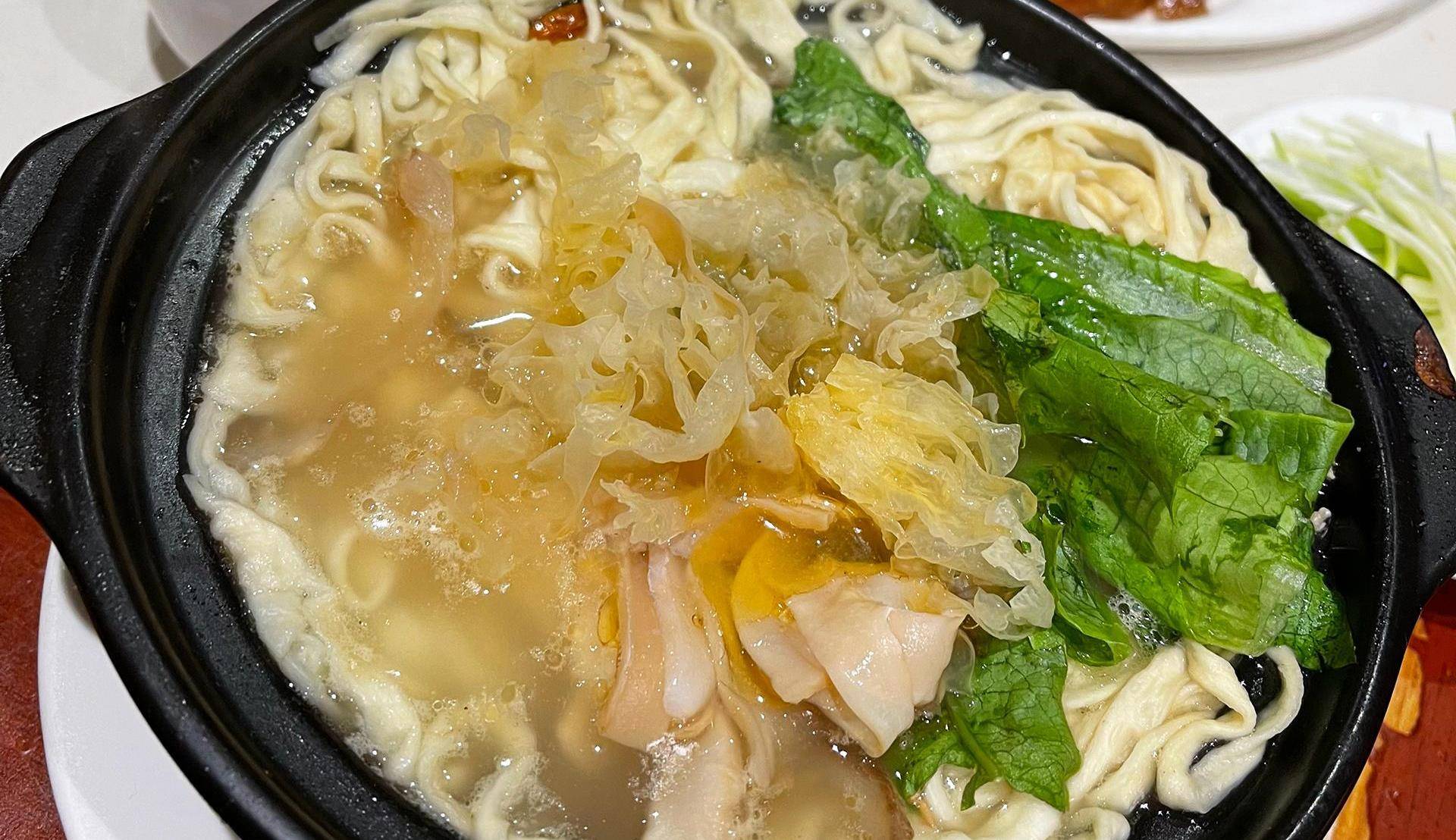 很多人只知道江西的米粉很出名,其实面条做得也一样出色,尤其是这个伊府面。它是用面粉还有鸡蛋,揉和至干湿适度,切为细条,入油炸至微黄,接着放入鸡汤中去煮,加上各种配料。