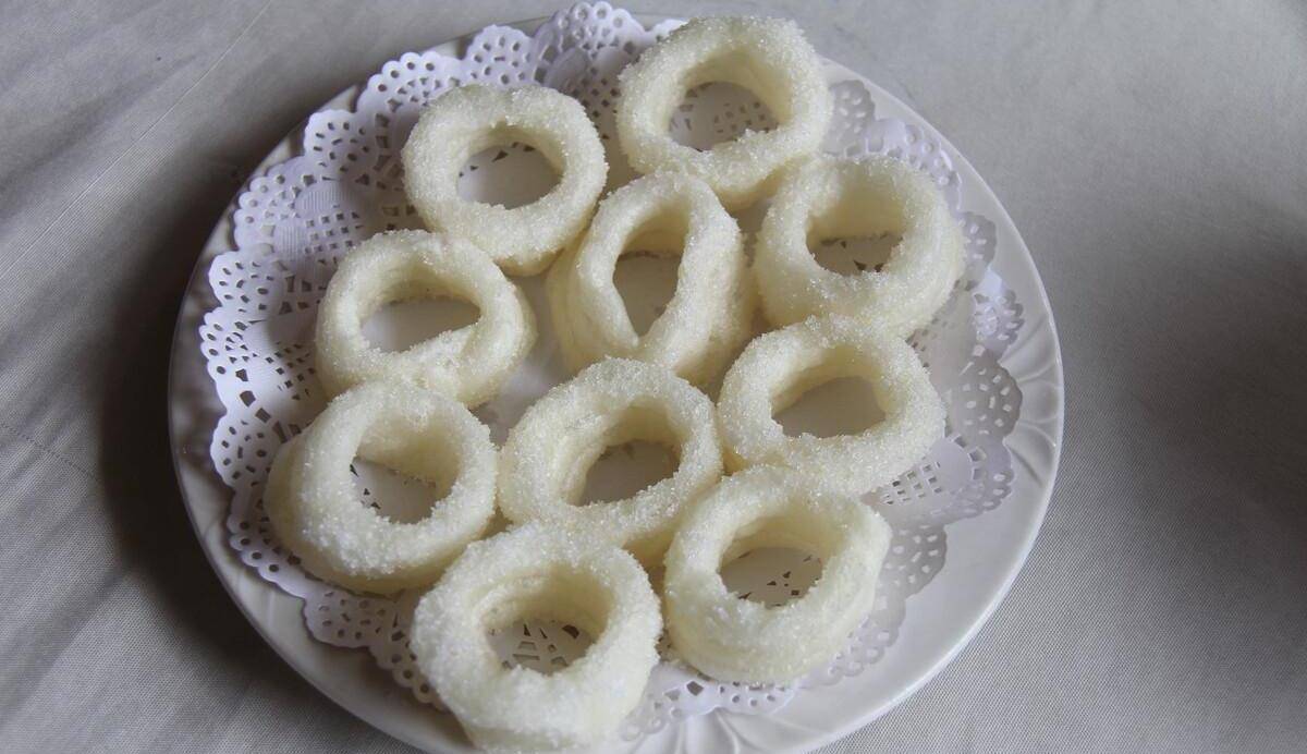 白糖糕是“江西五大传统名点”,它的制作比较复杂,要先把糯米经浸泡、洗滤,入石臼舂成细粉,冲开水揉和,搓为细条,展为薄片,多层叠起,弯转成圈,入油炸至金黄,起锅滤油,以白糖、米粉混和撒于糕上。