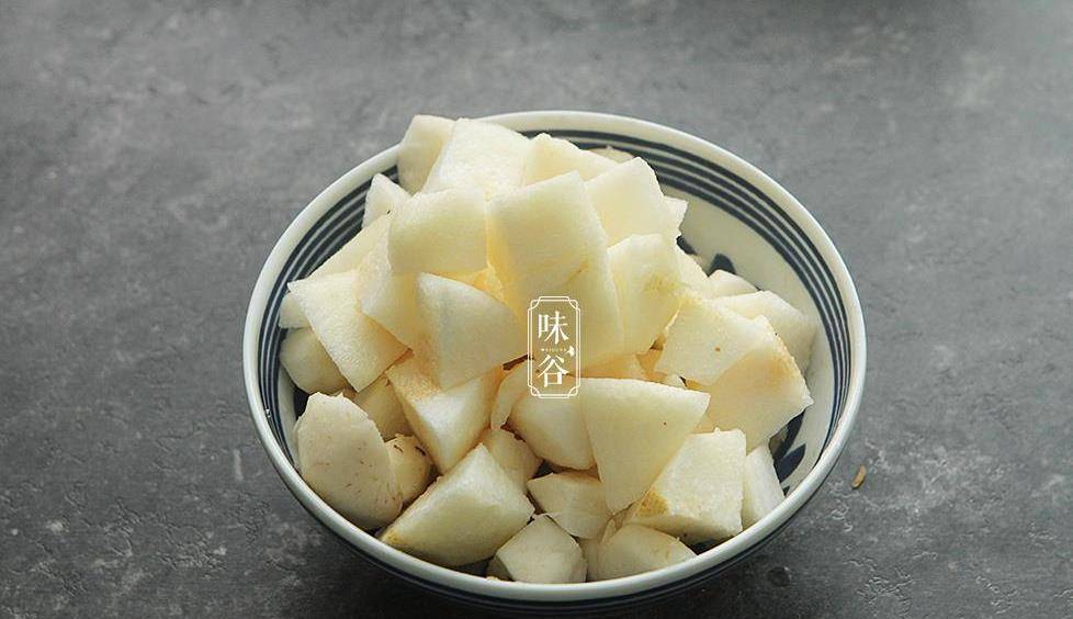 3、把雪梨和马蹄去皮切小块待用。