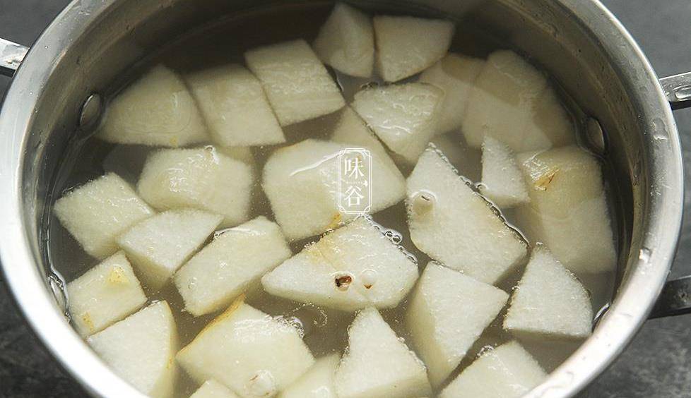 4、雪梨、马蹄与薏米一起放入锅中,加冷水用中火煮开,转小火再炖30分钟就可以了。
