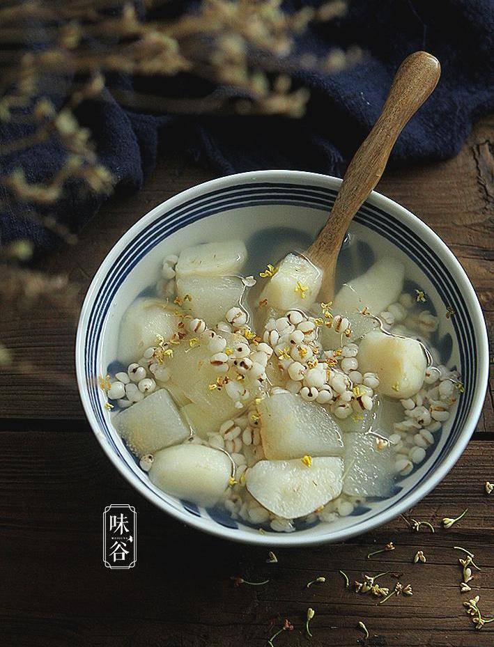 马蹄 15个、梨子 2个、薏米 60克、桂花 适量、 冰糖 适量
