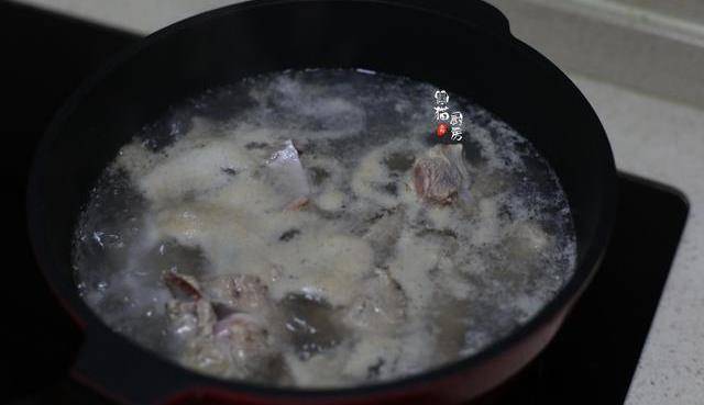 3.剁成块的鸭肉要放入冷水锅中,大火烧开,煮1-2分钟,煮沸后的表面会有许多浮沫,都是鸭肉里渗透出来的血水和杂质,用这个办法也能去掉鸭肉的腥味。
